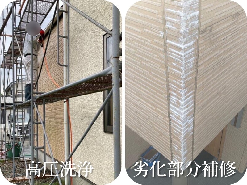 <前の記事 記事一覧 次の記事> 外壁リフォーム1 塗装 2026/01/09 (金) 『 外壁リフォーム 』 経年汚れが見えるようになり塗装を実施 □築年数:10年経過 (2014年竣工) □外壁材:窯業系サイディング ■足場 ■洗浄 ■劣化部分補修 ■既設コーキング撤去養生 ■コーキング打替え ■下塗り ■仕上塗り1回目 ■仕上塗り2回目 □サイディング用下塗材:パーフェクトサーフ □仕上塗料:グランセラトップ Before Before経年汚れ 高圧洗浄⇒劣化部分補修 To be continued in our next number. <前の記事 記事一覧 次の記事> 注文住宅、店舗、リフォーム、メンテナンス、外構(エクステリア)、造作収納、その他、家にまつわるお悩み事のご相談承ります。 まずはお気軽にお問合せ下さい。 【フォームからのお問合せ 】 【お電話でのお問合せ 】 このページのトップへ
